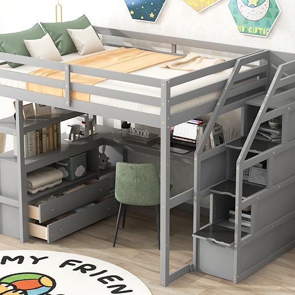 Full Size Loft Bed with Desk and Shelves, Two Built-in Drawers, Storage Staircase, GrayThis full size loft bed with desk, shelves and drawers is a simple and stylish bed frame that coordinates well with a variety of decor styles, allowing you to elevate and enhance your space with ease. Staircase can ensure that you can reach the upper bunk safely, and can also provide storage space for your items. Made of solid solid pine wood with strong support slats, this bed is durable and sure to accompany you for many years to come. What's more, it's a desk, shelf and two large storage drawers all in one.DescriptionMaterialPine Wood+MDFSizeFullColorGrayNumbers of Package3Spring boxNo needAssembly RequiredYesOriginVietnamDimensionsOverall Product Dimension95.1''L*57''W*65''HPackage DimensionPlease refer to the SpecificationBed Dimension76''x 55.5''Total height65''Overall Product Weight295.5lbLoft Bed Weight Capability350lbRecommend Mattress thickness6''[Multifunctionl Design]This loft bed includes a desk, shelves storage staircase and two large storage drawers in one.Not only provides you with a place to work or study, but also provides a large storage space.[Maximized Space] The full loft bed can save plenty of room for you to place other furniture in your bedroom. This bed provide ample storage for your everyday items.[Sturdy Frame] The bed structure is crafted from high-quality solid pine wood, solid pine legs and a strong, durable frame so that the bed is sturdy and durable.[Safety Guaranteed] Solid wood slats blend naturally into the already sturdy frame to give added ground-up support that provides stability.The loft bed features guard rails for added safety, and is accessible via the sturdy, slanted staircase. Enjoy many long years of relaxation and family fun, secure in this meticulously designed wood loft bed.[No Box Spring Needed] The wood slats support the mattresses not to slide and increase the service life.