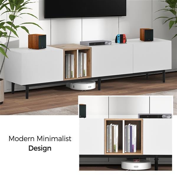Modern TV Stand for 80'' TV with 3 Doors, Media Console Table, Entertainment Center[ For TVs Up To 80-inch ] The TV stand supports TVs up to 80-inch. Any TV under 80 inches fits perfectly with this cabinet . [ Unique design ] This color matching design makes this TV cabinet simple yet unique. It's perfect for modern minimalist decor but also fits in with other decor styles. [ Multi-Purpose Cabinet & Concealed Storage ] This TV cabinet is a storage master. In addition to the TV, you can also put TV components, game accessories, books, decorations and so on. With a simple, geometric construction, this entertainment center provides open shelving space for all of your beautiful decors, magazines, or books. [ Drop Down Doors Design ] The TV stand is equipped with drop down doors. Compared with traditional TV cabinets, you can access your favorite items more easily. [ Sturdy and Durable ] The cabinet is made of high-grade MDF and high-quality hardware. Excellent workmanship ensures beauty and durability. [ Easy Installation ] The assembly process is completed with simple step-by-step instruction.Each screw and pin has its own code and clear labels to help you assemble easily.Additional InformationColorWhiteStyleModernMaterialMDF BoardCapacityOverrall:165lbs Panel:77lbs Shelf:44lbsPackage IncludedTV Stand & Screw Pack & InstructionThe TV stand supports TVs up to 8 -inch. Any TV under 8 inches fits perfectly with this cabinet .This color matching design makes this TV cabinet simple yet unique. It's perfect for modern minimalist decor but also fits in with other decor styles.This TV cabinet is a storage master. In addition to the TV, you can also put TV components, game accessories, books, decorations and so on.The TV stand is equipped with drop down doors. Compared with traditional TV cabinets, you can access your favorite items more easily.The cabinet is made of high-grade MDF and high-quality hardware. Excellent workmanship ensures beauty and durability.The assembly process is completed with simple step-by-step instruction.Each screw and pin has its own code and clear labels to help you assemble easily.